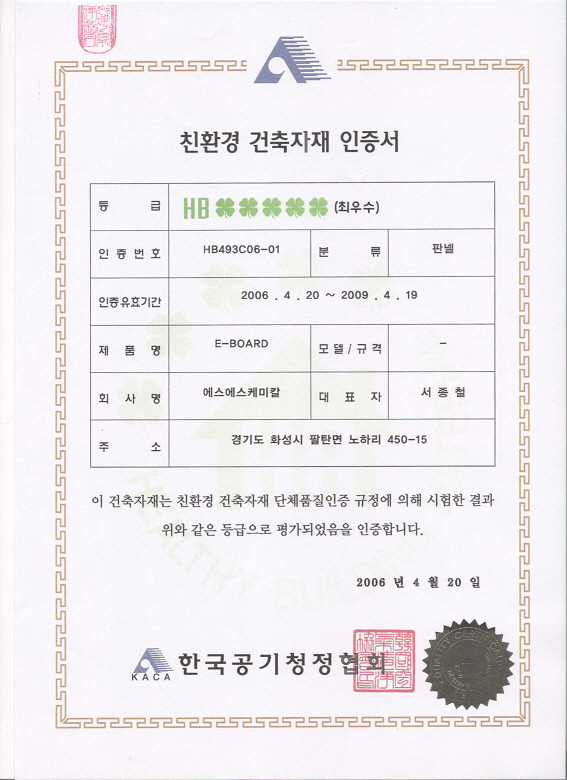 (주)이보드의 e*보드가 대한 공기 청정회로부터 "크로바 5개"의 친환경 최우수 건축자재 마크를 획득하였습니다.